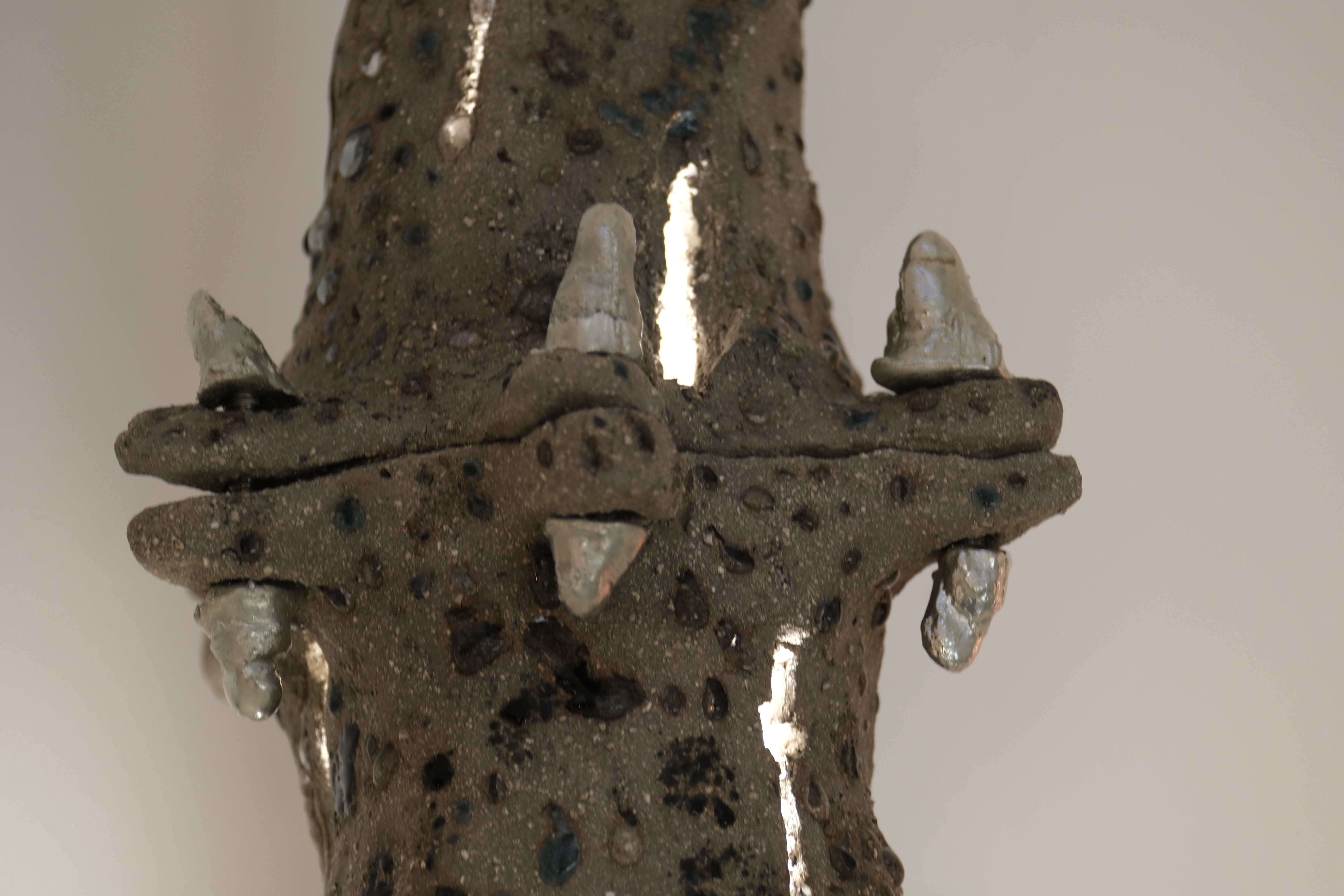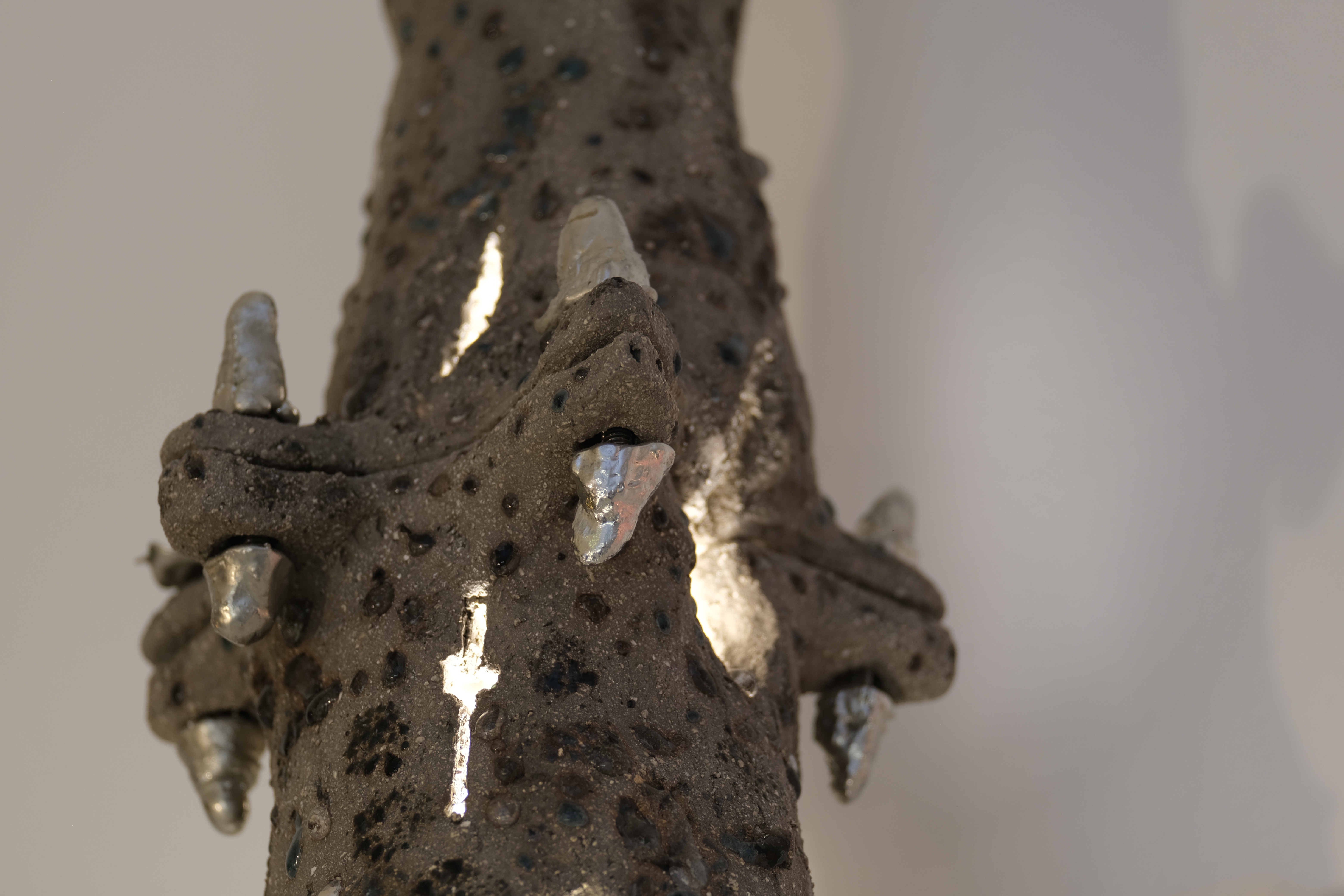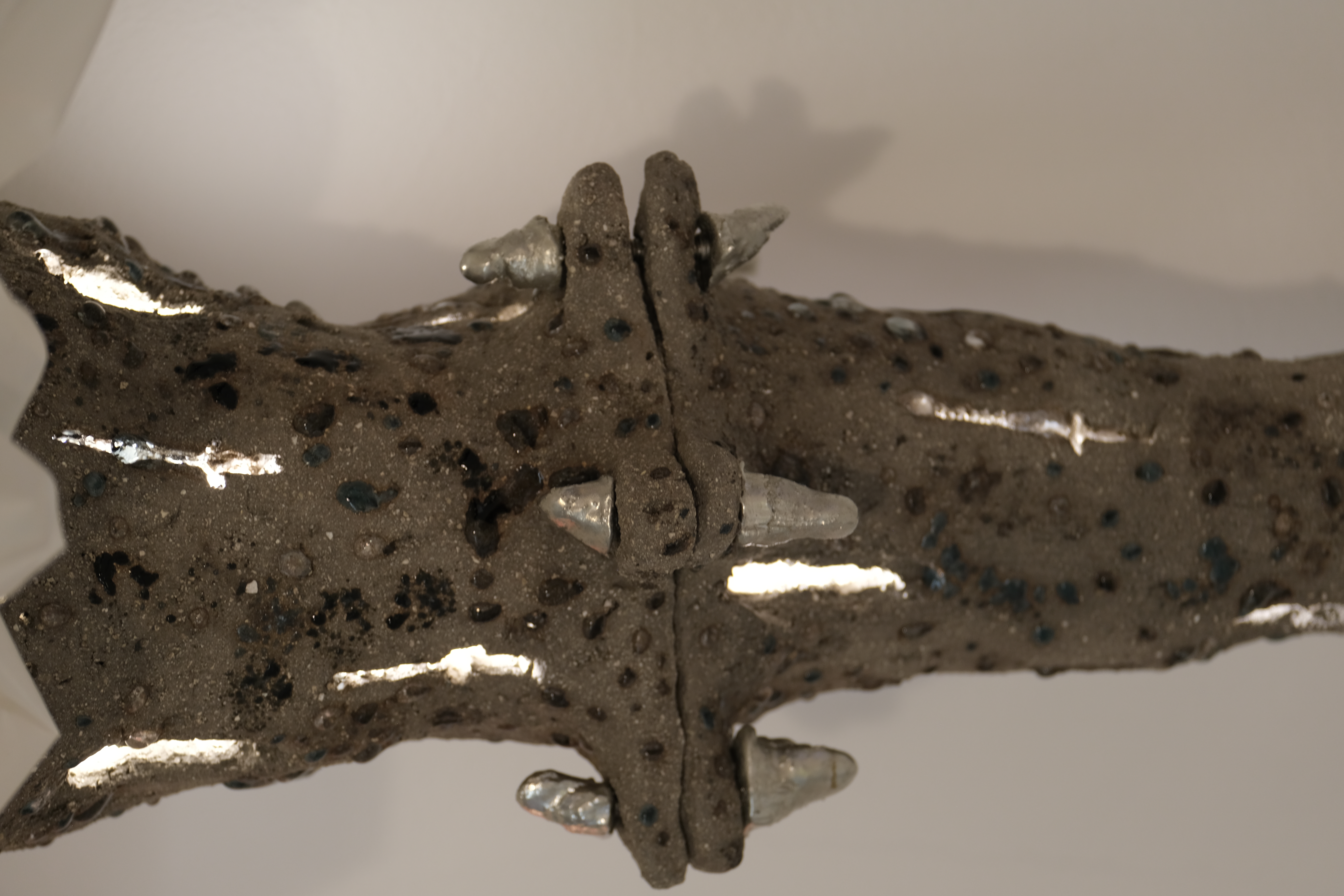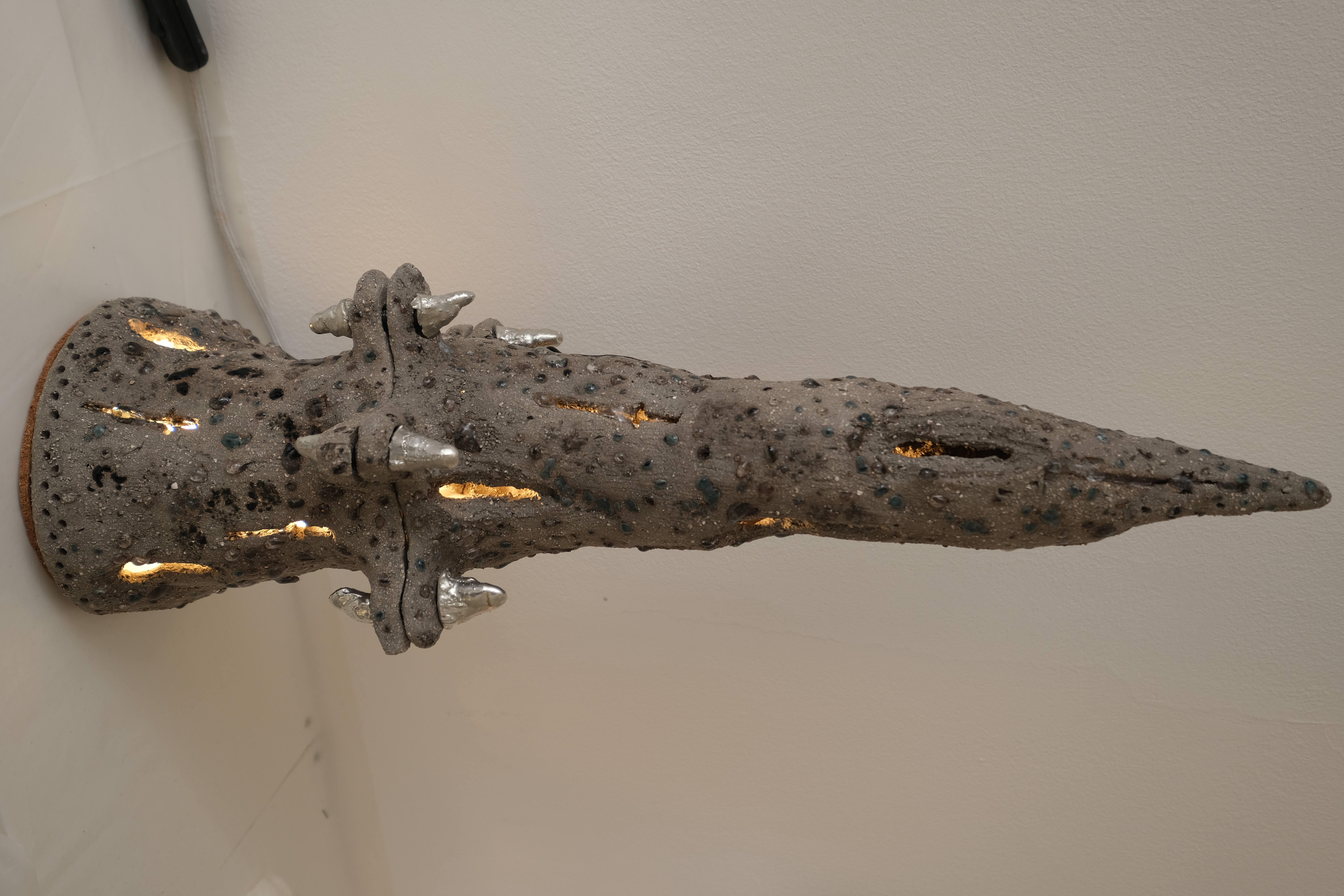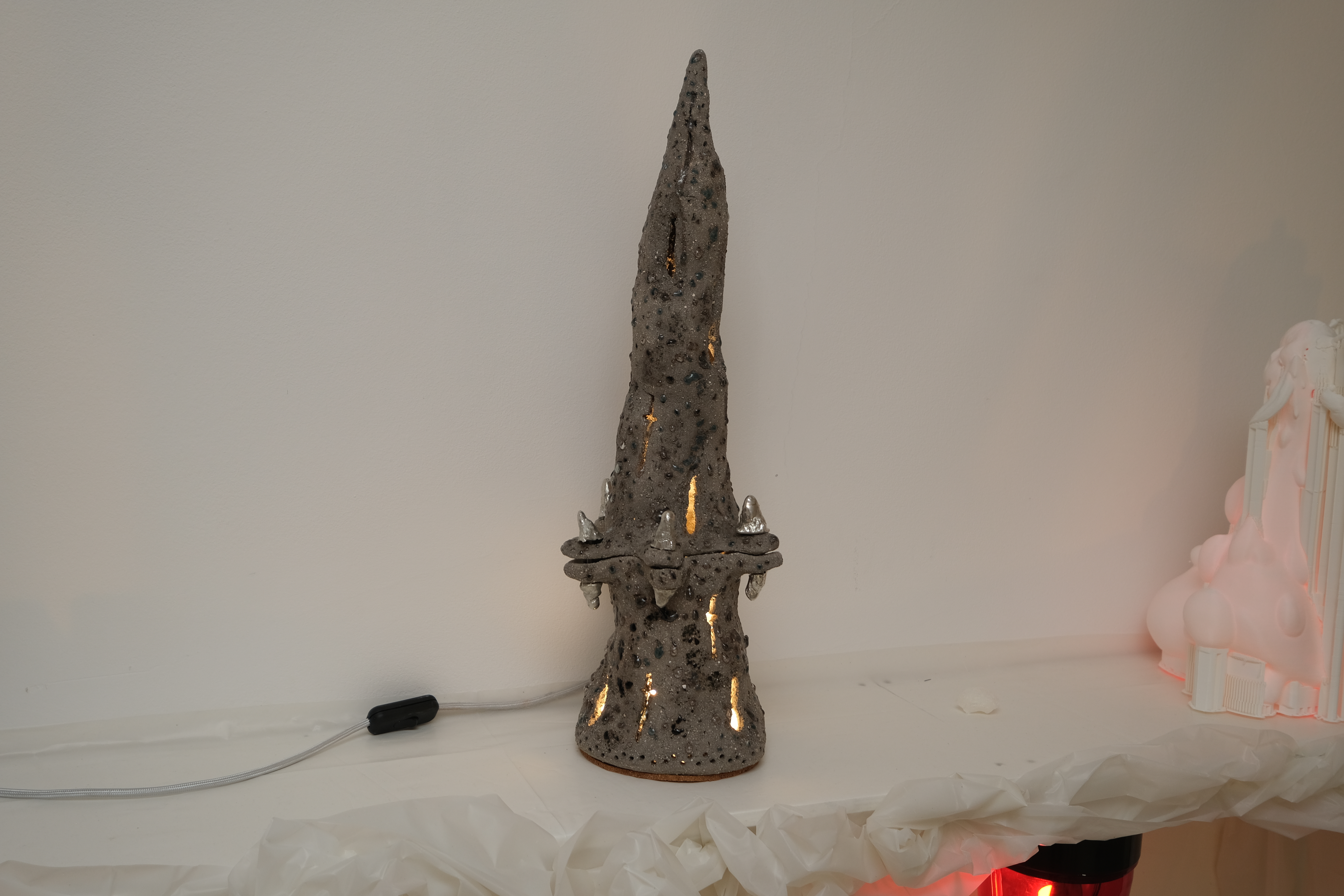 Clay, bora silicate glass scraps, pewter, bolts, paper, cable, light fixture