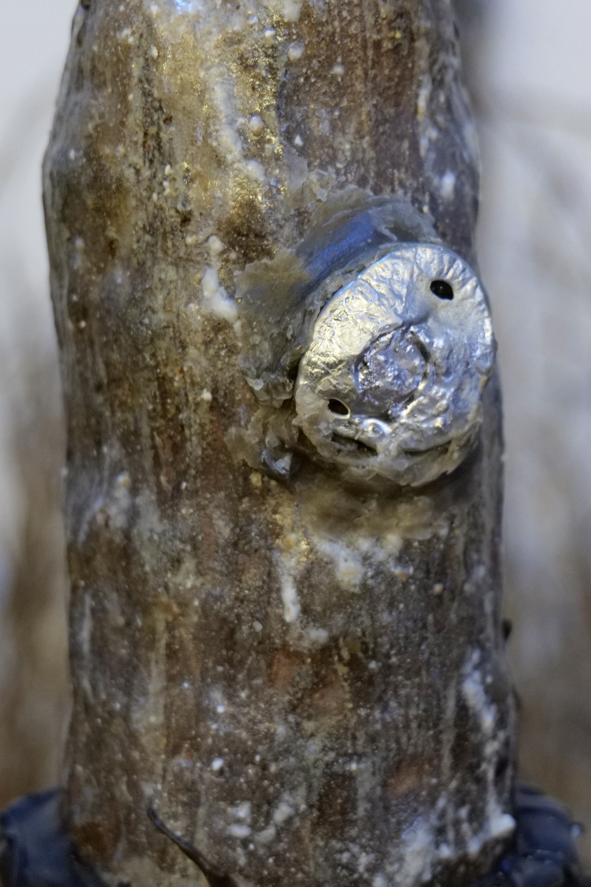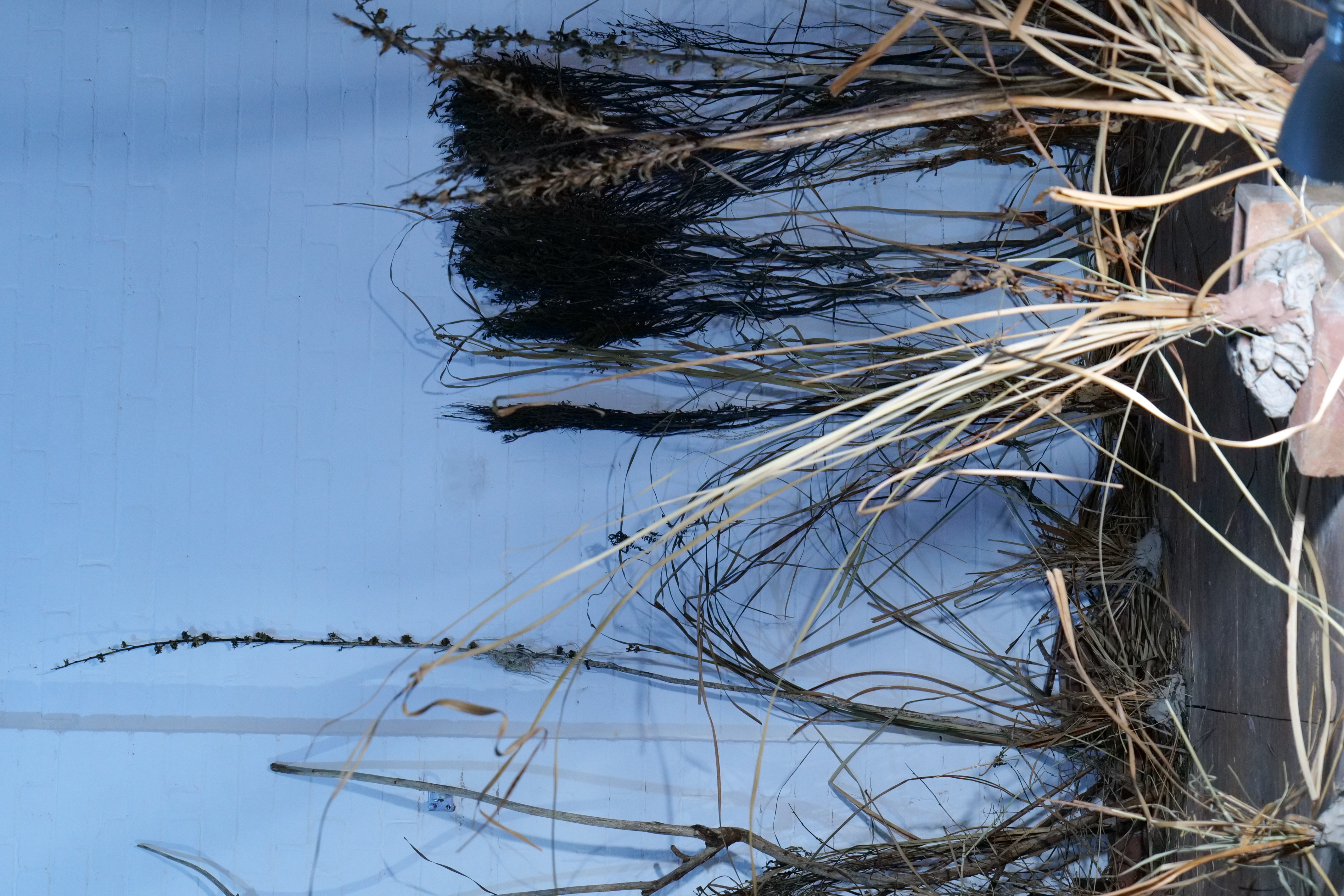 Localy forgaed clay, ash glazes, crushed marbels, naturally dyed wax, pewter, steel hinges, concrete, bricks, unfired clay and organic plant material.